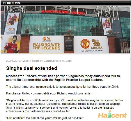 自从格雷泽家族收购曼联后,红魔的商业开发势头非常迅猛。昨晚(1月29号)曼联官网宣布,他们已经和泰国啤酒商Singha胜狮续签了一份长达3年的合同,双方的合作会一直延续到2016年。