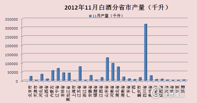 2012年,中国白酒业受到多方面因素的影响,发展速度明显减缓,1-11月,全国白酒产量达1023.32万千升,11月产量为115.09万千升;从白酒产量增速来看,明显回落,1-11月白酒产量增长18%,增速同比下降12pct。