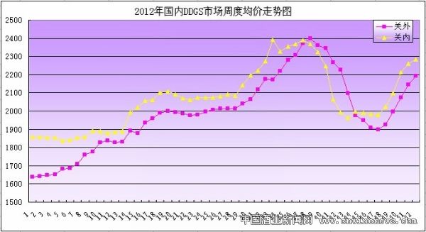 由图可知,在12年度第三季度的前半段之前,国内DDGS市场呈现明显的上涨态势,主要是受到了玉米价格震荡走强、养殖需求表现良好,以及酒精企业开机有限、DDGS库存不多的支撑。在9月份至年底阶段,DDGS走出“V”字型趋势。其影响因素主要有以下几点:首先,9月中下旬开始,国内新玉米进入收割上市阶段,玉米供应增加,价格回落,其成本支撑作用减弱;其次,玉米上市后,酒精企业原材料收购难度降低,企业开机热情恢复,DDGS实现增产,库存量上升,压迫价格回落;而在DDGS价格走低之后,酒精市场同样不见起色,面对严重的库存压力,多数厂家开始低价走货,且开始逐步限产、甚至停机以求减轻库存压力。此举效果明显,DDGS订单明显增多,使得多数企业的DDGS处于无库存状态;此外,由于养殖终端市场即将进入肉蛋禽的消费旺季,养殖效益回暖,且养殖存栏恢复到高位,饲料需求大增,开始拉升DDGS走势。同时在酒精效益不佳的前提下,厂家也更乐意推涨DDGS,以求成本回补的最大化。