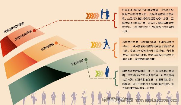 马斯洛的需求理论指出,人的最高需求是自我实现的需求,其次是尊重的需求,最低的需求是生理的需求。而现在白酒从业人员,对终端的作用仅仅局限在第一阶段,也就是说,经销商的业务员将终端老板当成拿工资的来源。为什么要尊重他们?是因为他们做不好自己的工资就拿不到,很少有人能够从心里与终端老板做朋友,满足老板的高层次需求。
