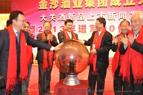 1月27日,“金沙酒业集团成立庆典暨进军20亿誓师大会”在贵阳举行,新成立的宜化金沙酒业集团由贵州金沙窖酒酒业有限公司、贵州大关酒业有限公司、河南豫缘春酒业、大由粮品(北京)食品有限公司、澳大利亚亚瑟格伦酒庄等子公司组成。在成立大会上,金沙酒业集团总经理郑钢带领集团5个公司代表团队上台交纳战金,并在大会上郑重宣誓,2013年全集团将进军20亿元销售目标,2015年完成50亿元销售目标,2020年实现100亿元销售目标,为“创一流品牌,建百亿酒业”的目标努力奋斗,为贵州酒业产出发展作出应有贡献。金沙酒业集团董事长董兵代表集团接受战金。