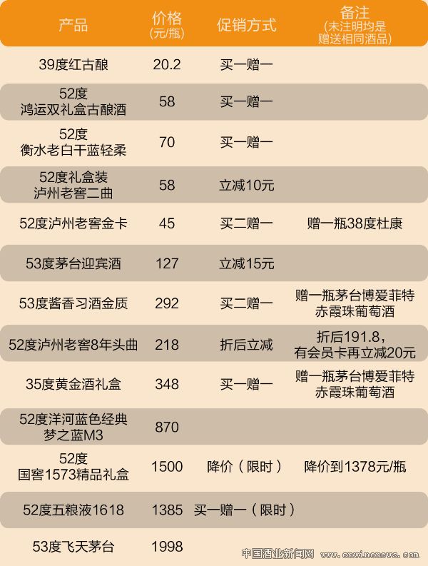 与节前相比,节后超市在白酒促销方面的力度更大,参与促销的白酒品牌也更多,有习酒、杜康、西凤、郎酒、泸州老窖、衡水老白干、茅台白金酒、茅台迎宾酒、烟台古酿等十多种品牌。