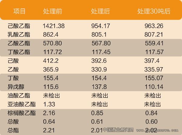 本次实验中处理成品酒所用的活性炭为ZS-801分子筛活性炭。其处理前后数据如下: