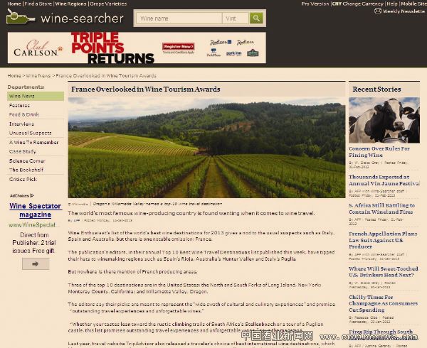 《葡萄酒观察家》最近公布了“2013全球最佳葡萄酒旅游胜地”,意大利普利亚(Puglia)、西班牙里奥哈、澳大利亚猎人谷等著名酒区均上榜,独有法国产区赫然缺席。
