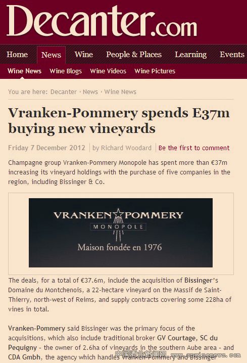 世界第二大香槟生产巨头波马利集团(Vranken-Pommery Monopole)斥资3700万欧元收购香槟产区5家公司,以增加葡萄园面积。本次交易共计3760万欧元。包括Bissinger公司旗下位于圣蒂埃尔高原(Massif de Saint-Thierry)的22公顷Domaine du Montchenois葡萄园,共签约供应葡萄树为228公顷。