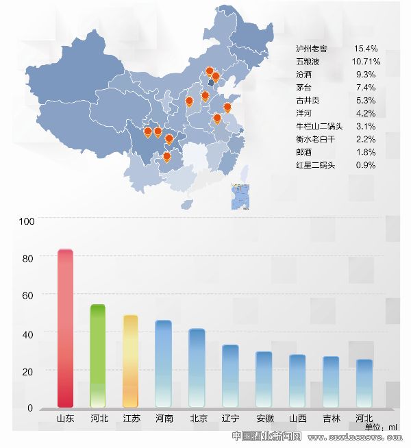 在本次调查中,人均酒量排名前五位的分别是:山东83.1ml、河北52.6ml、江苏42.3ml、河南36.3ml、北京26.7ml。