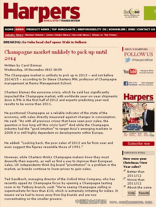 法国兰斯管理学院(Reims Management school)香槟管理学博士、葡萄酒大师Steve Charters认为,香槟市场不可能在2013年前复原,在2014年~2015年之前恢复的希望也不大。