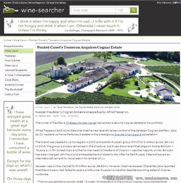 法国波尔多波亚克产区著名的庞特卡奈酒庄(Pontet-Canet)庄主A文章来源华夏酒报lfred Tesseron收购了第二座干邑酒庄。