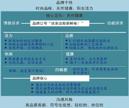 品牌的核心价值定位,也可以说是品牌的DNA(基因),是品牌的精髓和灵魂,核心价值成为品牌的终极追求,成为品牌识别与传播活动的原点,即品牌的所有传播行为必须围绕品牌核心价值而展开。每一个优秀的品牌都有自己的核心价值,比如依云,它不仅仅是一瓶矿泉水,它是一个概念,一种生活方式。在喝依云的时候,了解它的人会想到高山积雪在阿尔卑斯山经过天然过滤,及冰川砂层的矿化,从而享受一种天然、纯净、有品位的生活方式,这不是喝水就能体会到的。这五个价值元素,构成了燕京鲜啤的核心价值定位要素,然而,决定一个强大目标价值定位并不仅仅是画一张漂亮的价值元素分布图,然后描述几个价值点那么简单,这仅仅是品牌价值定位的开始,是方向。跟着就必须将价值元素点转化为与消费者沟通的语言,以支撑这些价值元素,也就是品牌的情感诉求和功能诉求。品牌的功能诉求(品类利益),它是品类长期发展的基础及产品溢价的工具,通过重塑鲜啤品类利益,找出新鲜的理由,以平实的沟通语言进入消费者的心智认知。品牌的情感诉求(心理共鸣),激发鲜啤品类利益的美好联想和新鲜体验,倡导一种亲近自然、健康有机的生活方式,聚焦天然环境,占位最美潇湘的区域资源,以此连接消费者的内心价值趋向。下图,描绘了我们是如何通过五个价值元素点,形成了燕京鲜啤的品牌传播沟通体系。