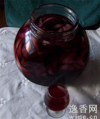 2、将洋葱装入玻璃瓶内,加上红葡萄酒。