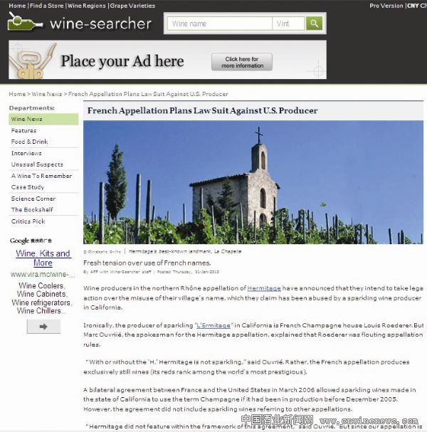 法国北罗讷河著名法定产区Hermitage葡萄酒生产商宣布,将起诉美国加州一家盗用Hermitage名称的起泡酒生产商。