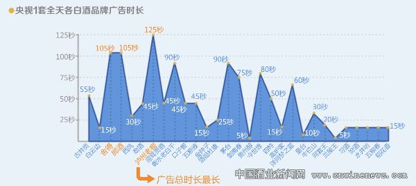 此外,央视一套全天广告播放时长超过一分钟(60秒)的酒品牌有8个,前三名分别是泸州老窖(110秒)、舍得(105秒)、郎酒(105秒)。