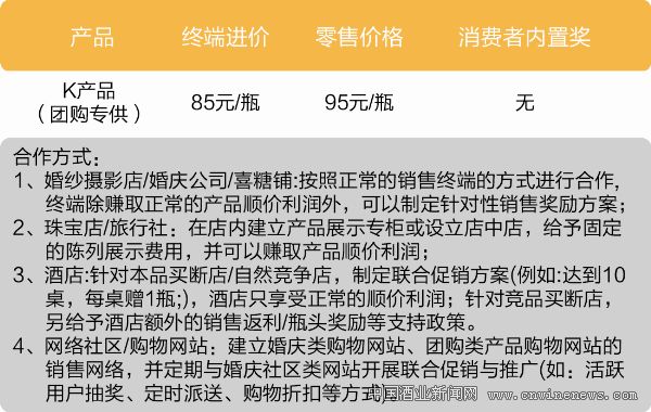 基于目标消费者活动轨迹的思考,拓展销售终端。将婚庆公司、婚纱摄影店、旅行社、珠宝店等婚庆场所拓展成酒水的销售终端;在终端价格设置上,终端进价略低于常规产品的终端进价,或保持终端进价不变,以渠道促销的方式拉低终端进价,以提高产品竞争力;在合作方式上,根据场所的不同因地制宜的灵活选择合作方式。K产品与销售终端的合作方式(见表2)。