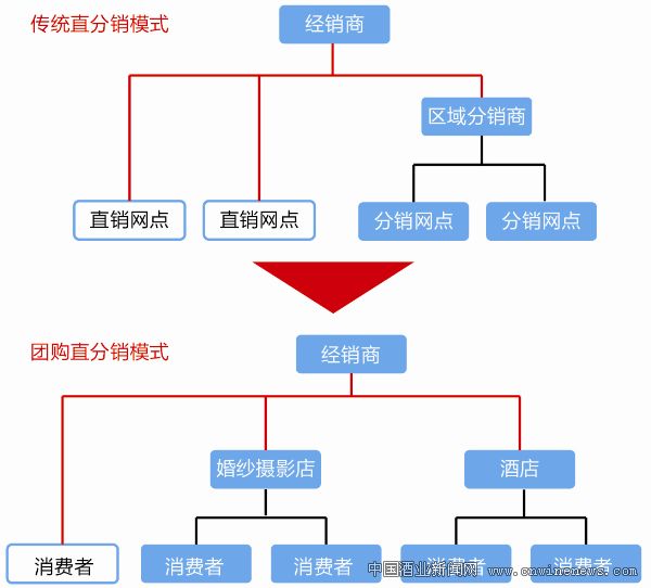 渠道分销涉及的渠道面广,渠道成员众多,酒店、流通、商超均扮演重要的角色。“团购直分销”模式与传统的直分销模式具有相通之处,但“团购直分销”模式以消费者作为运作模式的起点,渠道更加下沉。