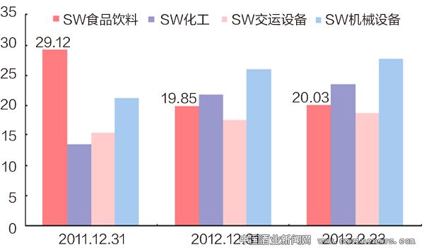 从对其它周期性行业的估值对比也可以看出,食品饮料的估值也已经足够便宜。中信建投证券研究发展部选取2011、2012年的静态PE和2013年的动态PE研究发现,食品饮料行业的PE已经下降到有竞争力的水平(见图6)。