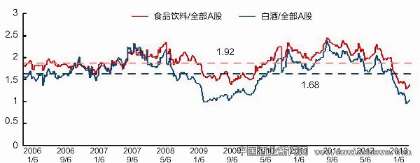 历史上来看,食品饮料和白酒相对于市场的溢价率均较高,2006年以来,白酒相对大盘的平均溢价率为68%,食品饮料板块为92%(见图7)。从历史数据看出,2009年金融危机时,食品和白酒的溢价率是一个低谷,白酒溢价率仅为10%,食品为50%。而目前食品饮料和白酒相对于全部A股的文章来源华夏酒报溢价均处在历史的地位,白酒还曾出现折价10%的现象。