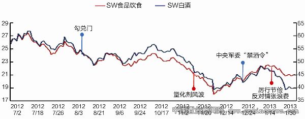 图1:2012年7月以来食品饮料及白酒板块的走势图