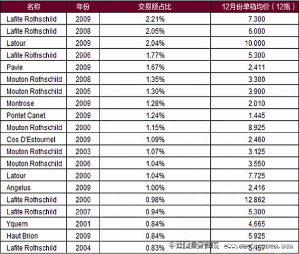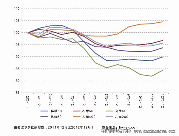 市场在2012年下半年得以企稳,2012年12月份,佳酿100指数和佳酿50指数分别上涨1.3%和1.8%。该交易所称,这主要得益于老年份波尔多一级庄佳酿的交易量上升,这一趋势从拉菲庄开始,并逐渐波及其他一级庄。