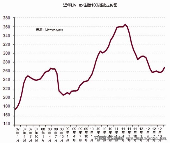 另外,2013年佳酿市场开局良好,伦敦国际葡萄酒交易所(Liv-ex)的佳酿100指数增幅创两年新高,1月底,Liv-ex佳酿100指数以268.13点报收,较2012年12月份增长了2.8%。Liv-ex投资指数上升2.4%,波尔多500指数升2.2%。佳酿50指数增长3.5%,一级庄连续第二个月领跑佳酿50指数。