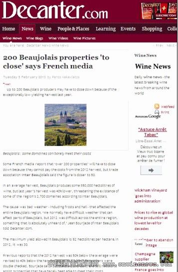 一些法国媒体报道称,因2012年酿酒葡萄大幅减产,法国薄若莱产区多达200家酒庄将面临倒闭。不过,薄若莱葡萄酒行业协会(Inter Beaujolais)的数据是约50家。