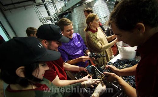 酿造波特酒首先要挑选大量的葡萄并去梗,然后将它们放入巨大的片岩石瓮中,接着再用脚踩出葡萄汁。下图是非常耗时的人工去梗