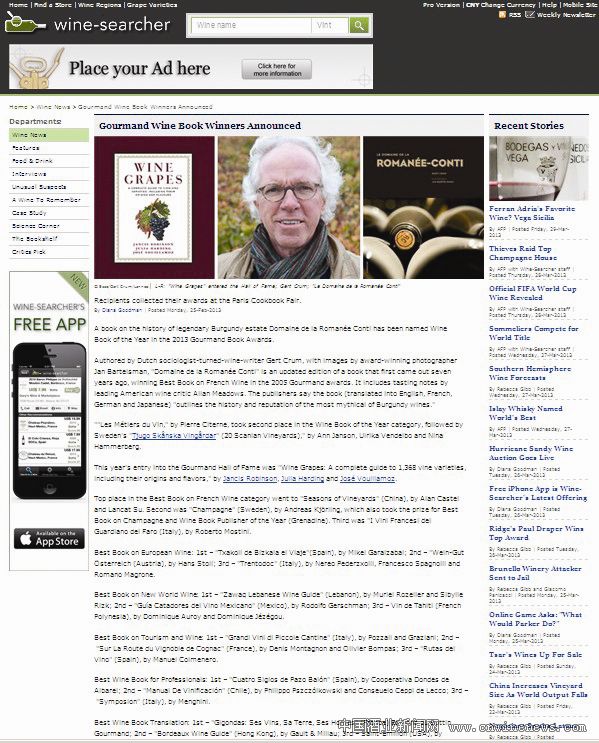 在近日举办的巴黎饮食图书博览会(Paris Cookbook Fair)上公布了“2013年度美食家葡萄酒图书奖”(2013 Gourmand Book Award)获奖名单。其中,一本关于勃艮第顶级酒庄——罗曼尼—康帝历史的图书《Domaine de la Romanée Conti》被评为“2013年度图书”(Wine Book of the Year)。