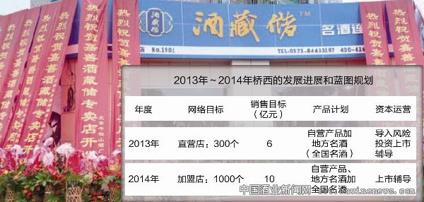桥西的目标就是以销售分(子)公司为手段,面向全国,在全国各大代表性大型城市,每隔500公里左右均设立中京集团的分公司、仓储基地。目前,桥西一共成立了近90家子公司,连锁店达200多家,其中“酒藏储”名酒连锁有100多家。在桥西的战略扩张计划中,计划投入数亿元、用2年~3年的时间在全国成立300个独立法人的子公司。桥西同时要求注册一家公司,必须筹备开设一家“酒藏储”连锁店,当然,连锁店的数量肯定超过子公司的数量,因为一个城市可能会有多家连锁店。