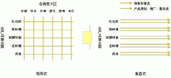 2013年1月,郎酒集团启动了一场涉及到6000多人的营销组织变革,将其“事业部+办事处”的“矩阵式营销组织结构”,变革成为以五大事业部垂直运作的“准公司制运营模式”。
