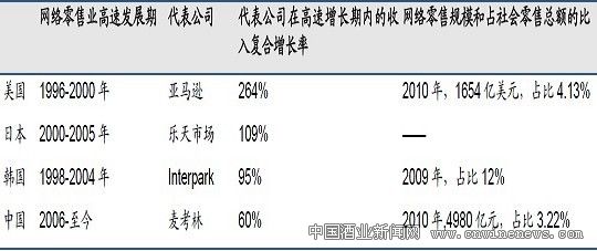 网络零售自美国产生后,在 1996-2000 经历了五年的高速增长。韩国和日本在 2000 年左右进入网络零售的高速增长期,网络零售企业的营业收入实现了快速增长。