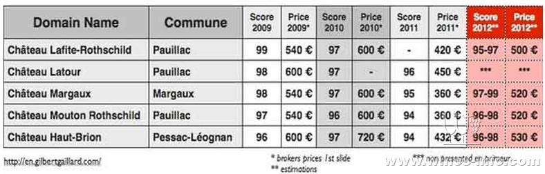 著名法国葡萄酒评论家Francois Gilbert和Philippe Gaillard为Wine Searcher网站评价了2012年份波尔多葡萄酒,公布了前十榜单。