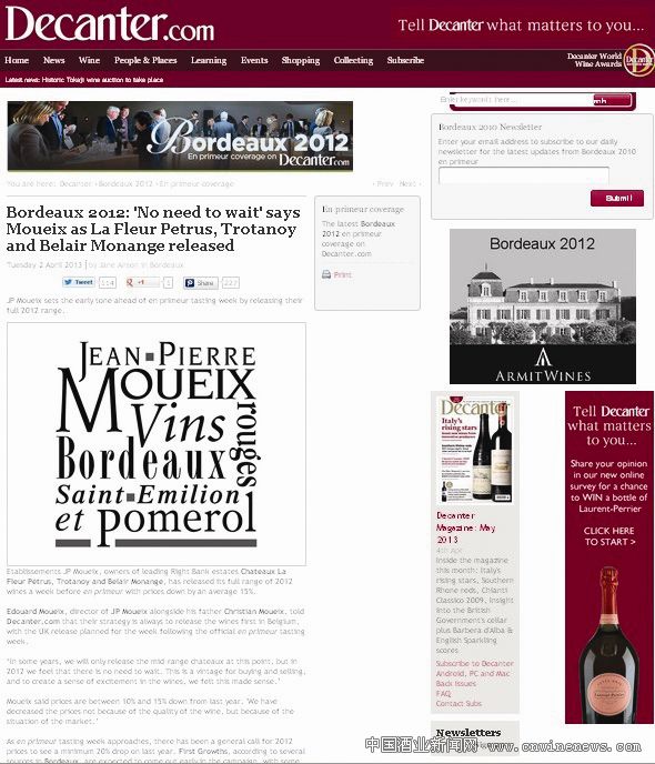 法国波尔多右岸顶级酒庄Chateaux La Fleur Pétrus、Trotanoy和Belair Monange的庄主Etablisseme文章来源华夏酒报nts JP Moueix于期酒品鉴周之前就已推出了其全部2012年份期酒,平均价格约下降15%。