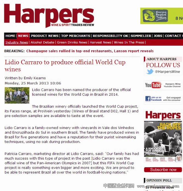 巴西五代经营的Lidio Carraro酒庄最终被指定为2014年巴西世界杯官方葡萄酒供应商。