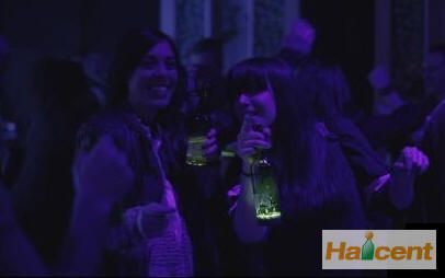 酒瓶根据不同动作作出不同的反应。当两个人用酒瓶碰杯时,两个酒瓶就会同时发光,当你举瓶畅饮时,LED则会快速闪烁。