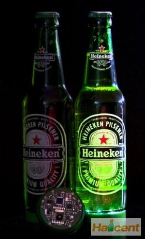 当将酒瓶放下一会,那么它将自动进入休眠状态,当被拿起时,它又会慢慢苏醒。啤酒瓶的灯光还能够通过远程控制,让酒瓶的闪烁与音乐的节拍一致,从而将舞会转换为一个灯光秀。