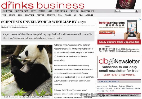 环境保护组织Conservation International的最新研究表明,到2050年,全球适合种植葡萄的面积将下降73%,主要原因在于灌溉用水的短缺。