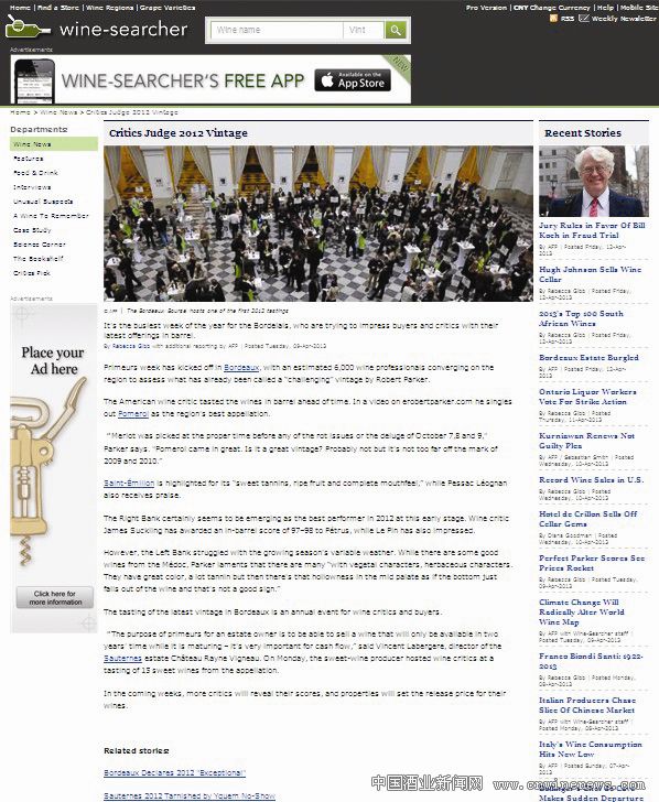 日前,一年一度的波尔多期酒品鉴活动正式开始。约6000多名葡萄酒专业人士从世界各地聚集于波尔多,品鉴评价2012这个被罗伯特·帕克描述为“颇具挑战”的年份。