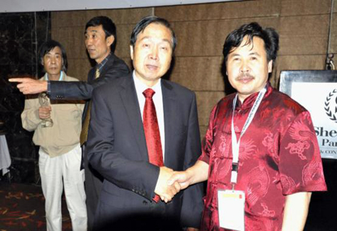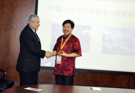 图一、巴拿马商务部部长季哈诺为北宗黄酒董事长赵生满先生颁发金质奖牌