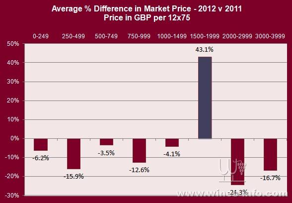 右手边的一级庄降价幅度最大,而正是它们在次级市场中有试探性的交易。但总体来说,其他的2012年份波尔多未能激起市场兴趣。
