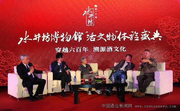 流沙河、樊建川、李栓科、沈怡方、曹景行在体验盛典上畅谈“水井坊600年活文物”。