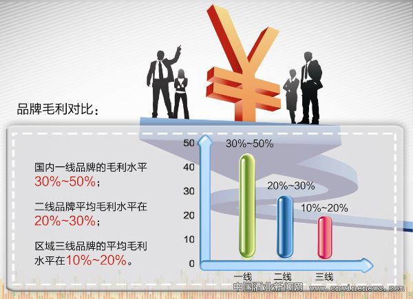 笔者通过对一二线品牌以及区域性品牌综合分析判断,目前国内一线品牌的毛利水平在30%~50%;二线品牌平均毛利水平在20%~30%;区域三线品牌的平均毛利水平在10%~20%。而二三线品牌的盈利水平呈现出区域不平衡、品牌不平衡的特点,由于受产品结构以及市场竞争双重因素影响,豫酒、冀酒、鲁酒企业的综合盈利水平较低,川酒、贵酒以及东北酒品牌的综合盈利水平稍高。从这个层面也可以看出来,未来几年内,鲁酒、豫酒等板块的品牌竞争将会更趋激烈,如果不能在混战中崛起的话,区域中小品牌将会很快被淘汰出局。