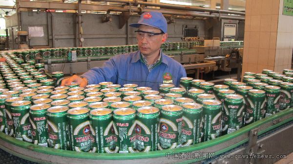 青岛啤酒五厂包装部部长王振竹在生产线上巡检