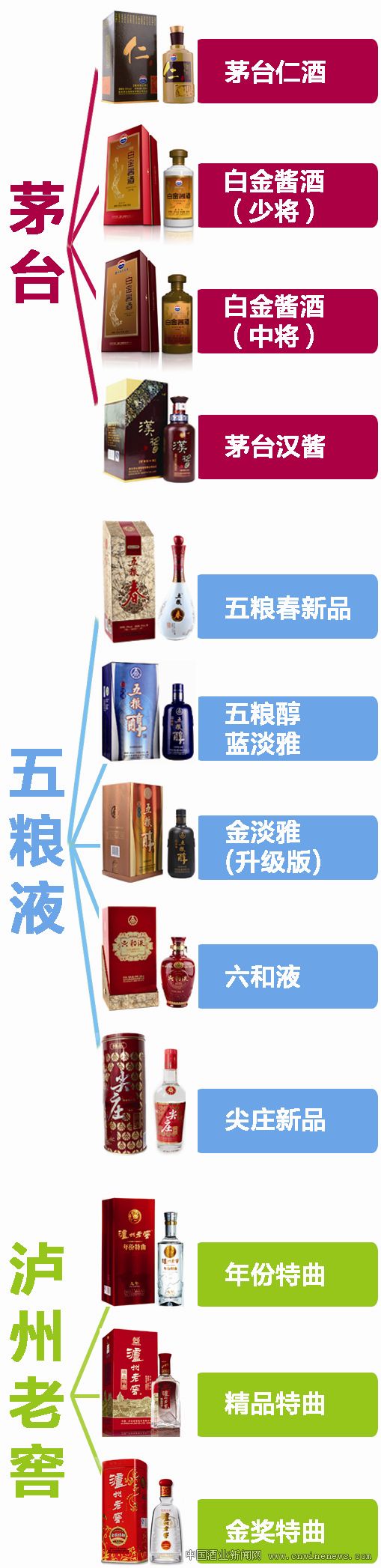 茅台集团在2012年5月推出了其中端产品茅台仁酒,价格为599元。同年8月,其子公司发布白金酱酒少将(300元)、中将(600元)等几款酒面市,在上市发布会中也提到此举是受金融危机影响的转型战略。此外,习酒的战略布局也不容忽视。