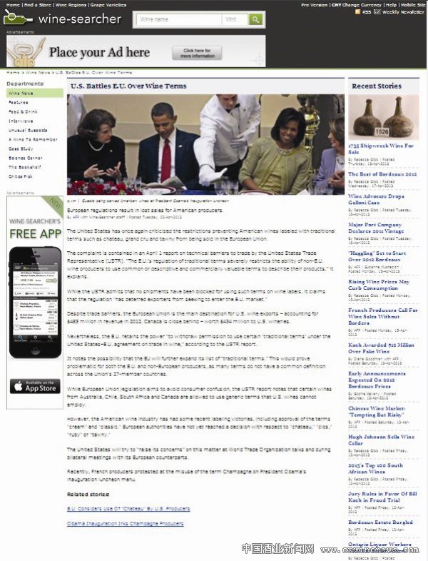 4月1日,美国贸易代表署(USTR)在技术性贸易壁垒报告中再度对欧盟提出指责。报告称:“欧盟关于传统葡萄酒术语的规定严重限制了非欧盟国家酒商使用常见的、具有描述性质和商业利益的术语来描述他们产品的权利。”