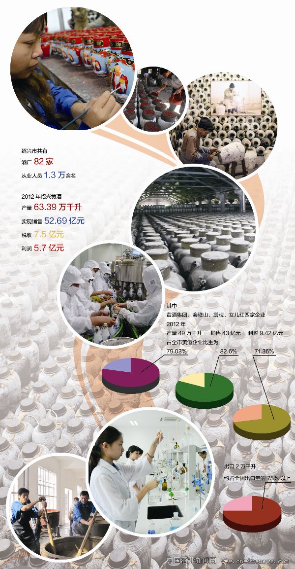 今天,绍兴市共有酒厂82家,从业人员1.3万余名。2012年绍兴黄酒产量63.39万千升,实现销售收入52.69亿元、税收7.5亿元、利润5.7亿元。其中黄酒集团、会稽山、塔牌、女儿红四家企业2012年产量49万千升、销售43亿元、利税9.42亿元,占全市黄酒企业比重为79.03%、82.6%、71.36%。出口2万千升,约占全国出口量的75%以上。
