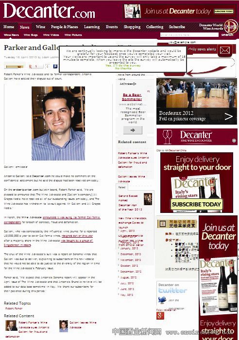 帕克在其网站公告栏中写道:“我们很高兴地宣布《葡萄酒倡导家》已经与All Grapes Media(加洛尼的公司)友好地处理了未决事宜,《葡萄酒倡导家》已经撤消了对加洛尼及其公司的指控。”