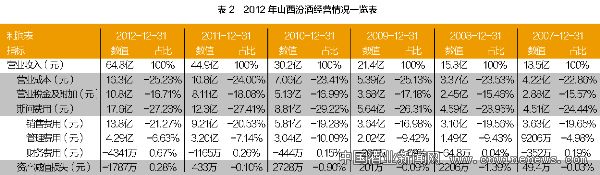 报告期内,公司完成成品酒生产量 41617千升,较上年增长 33.77%,商品酒销售量 39918千升,较上年增长 32.94%。 山西杏花村汾酒集团有限责任公司2012 年度营业收入为 107.04 亿元,利润总额为 18.67 亿元。