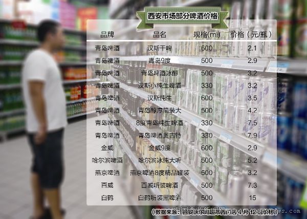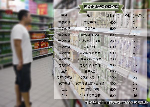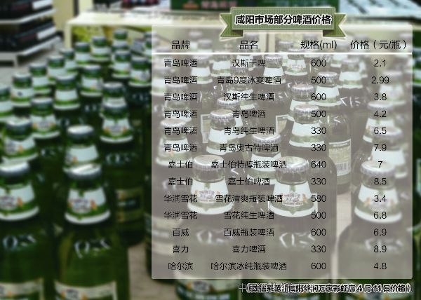记者注意到,在咸阳的各大型超市中,其他品类的啤酒比西安相对多一些,例如2.1元的宝鸡啤酒(600毫升)、2.1元的金威干啤(600毫升)、7元的嘉士伯特醇瓶装啤酒(640毫升广东产)、3.4元的雪花清爽瓶装啤酒(580毫升山西产)、6.8元的雪花纯生啤酒(500毫升四川产)、6.9元的百威瓶装啤酒(600毫升武汉产)、8.9元的喜力啤酒(330毫升广州产)。