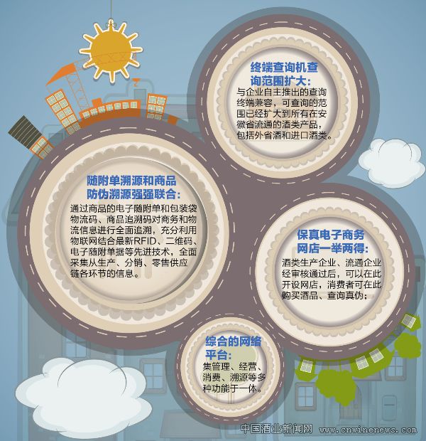 据安徽省商务厅相关负责人介绍,网站上线后,安徽省内的所有酒类生产企业、流通企业都必须进驻,只要在安徽市场上流通的酒都必须将其相关信息录入这个酒管平台。同时,在安徽省的酒管平台上,消费者不仅可以了解到省酒类流通市场综合信息,国家政策法规、地区酒管工作、行业动态、图片新闻,还可以使用防伪溯源查询、用户登记界面等相关功能。这也是对外进行商务工作宣传的重要窗口,更重要的是可以让广大消费者了解到酒行业、各个企业、各种酒的相关信息。