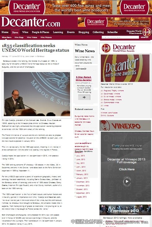 1855列级庄分级委员会主席Philippe Castéja近日在木桐堡举办的文章来源华夏酒报Vinexpo新闻媒体晚宴上宣布了这一消息。法国文化与环境部每年可以向联合国提交两份世遗申请,下一轮申请定于2014年1月。为了避免与法国另两项世遗申请——香槟与勃艮第发生冲突,1855分级制度申请将于2015年提交,在2016年收录联合国世遗保护名录。
