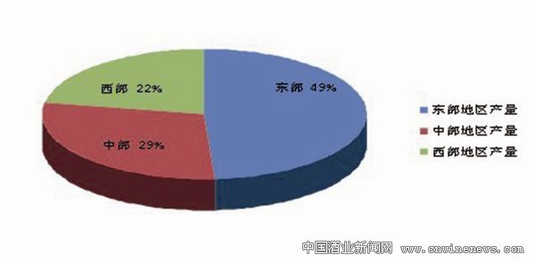 2012年全国饮料酒产量地区占比,东部为49%,中部为29%,西部为22%。